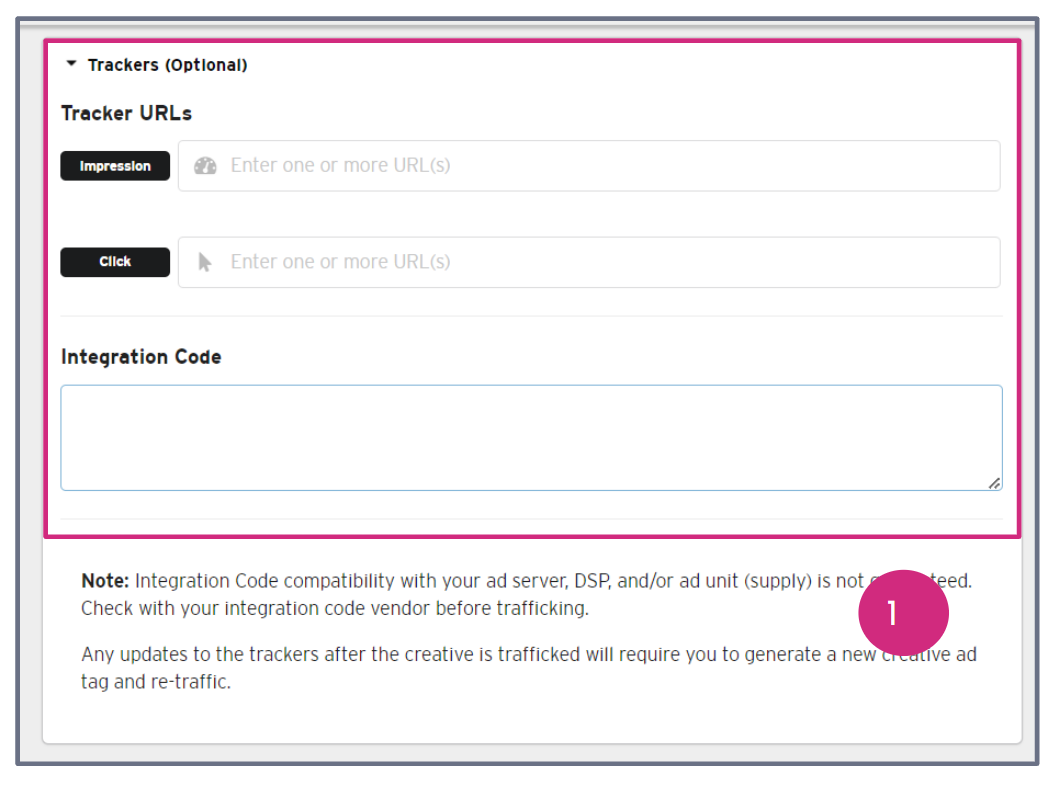 For a Carousel or a Story creative, which has different slides within a single creative, you have the option to add trackers to measure the clicks on each slide or the whole creative.