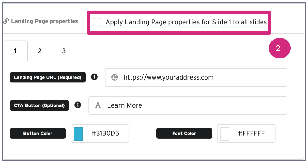- Under the Landing page properties section, uncheck the option "Apply Landing Page properties for Slide 1 to all slides"