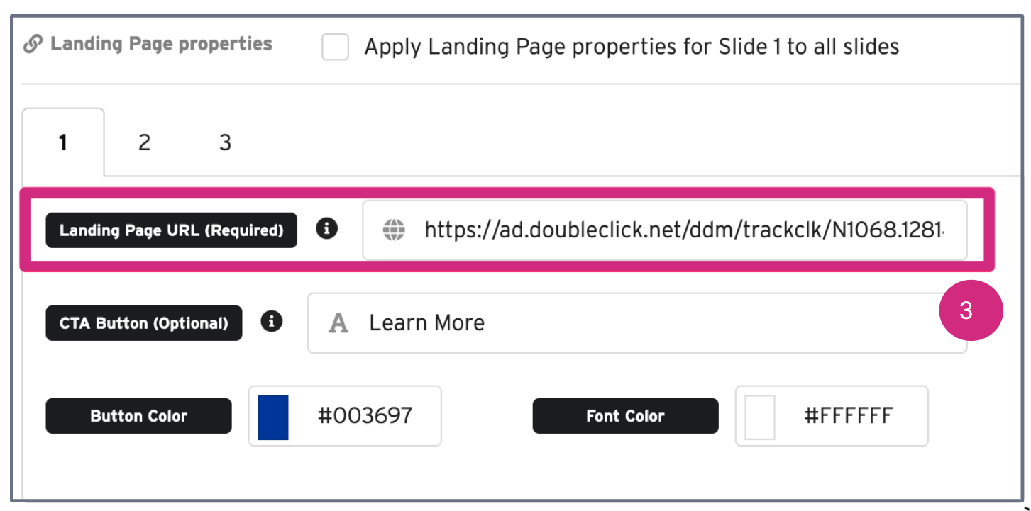 - Under the Landing Page URL field in each slide (1, 2, 3 etc.), you can paste the different click trackers