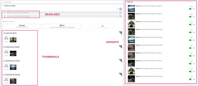 Multiple headlines and thumbnail combinations setup in Nova UI.