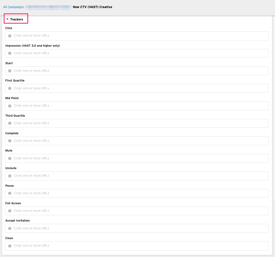 - The Summary (CTV/OLV) section includes information for VAST creatives such as number of ads rendered, clicks, CTR percentage, Scans and Scan Rate percentages.