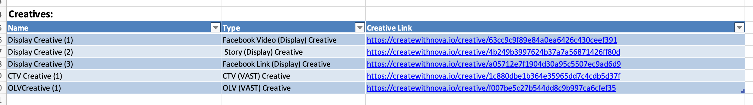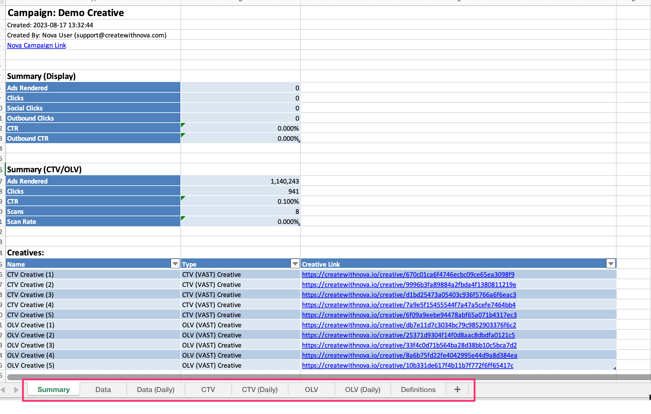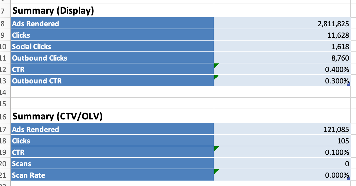 With the campaign performance report having CTV/OLV creatives, you can find the following summary: