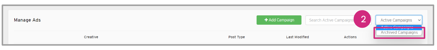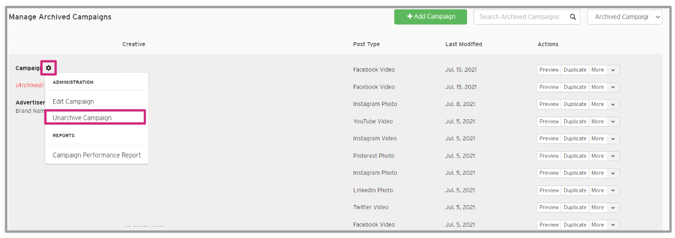 - Under the Archived Campaigns dashboard screen select the Gear icon in the campaign to be unarchived