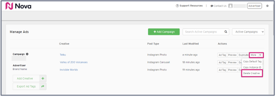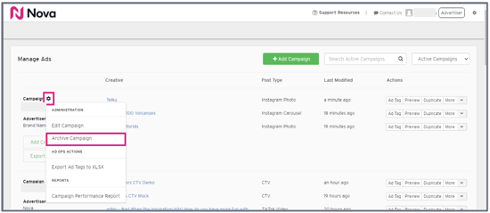 This article explains the steps to archive a campaign or delete a creative in Nova