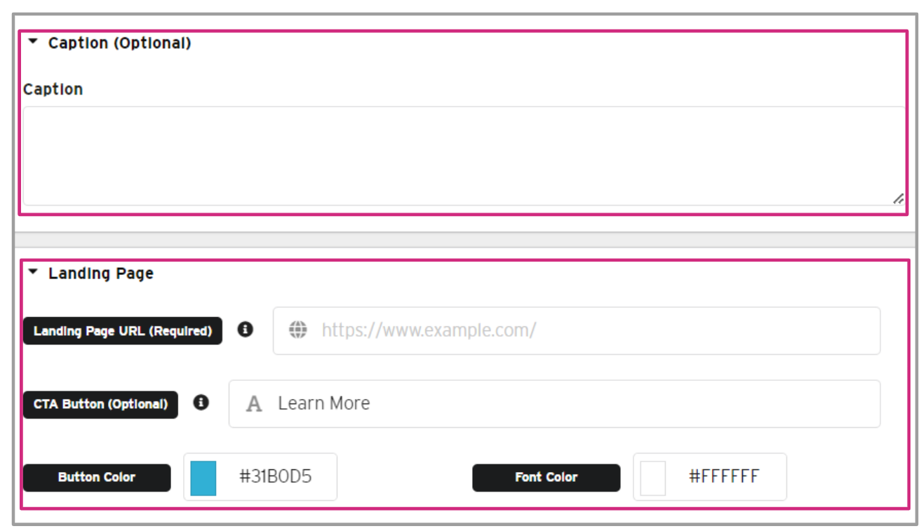 - Add the Caption (Optional), Landing Page URL (the URL of the poll on social media), CTA Button text, Button Color, and Font Color