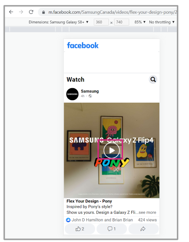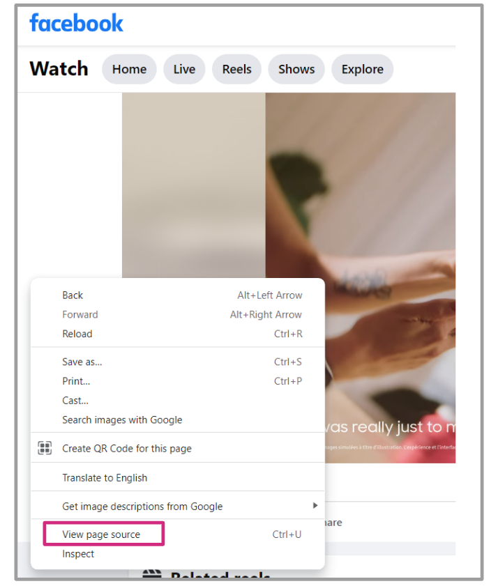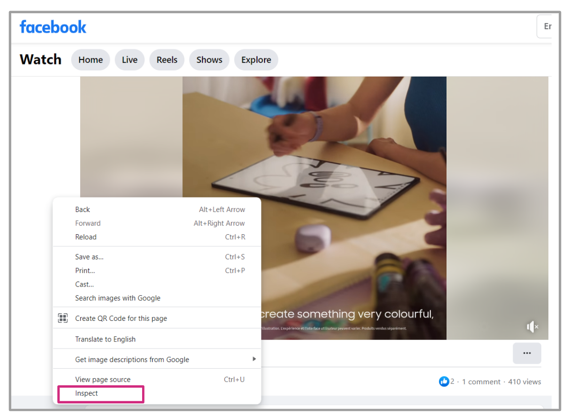 - Right-click on the individual post page of the Facebook video and select Inspect