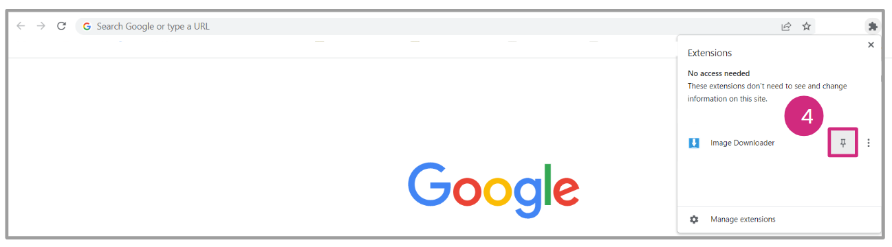 - Click on the Extensions (puzzle piece) icon at the top of the page and select Pin next to Image Downloader