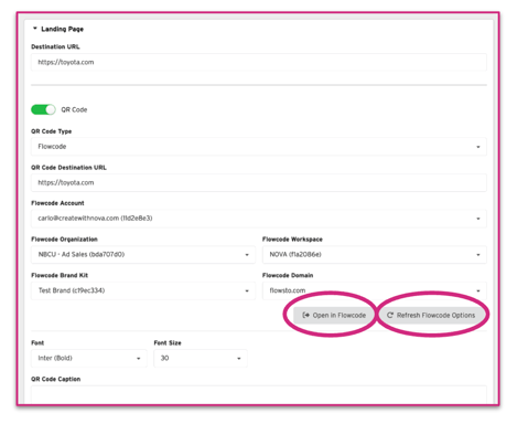 Enable the QR Code toggle, then select Flowcode in the QR Code Type dropdown.