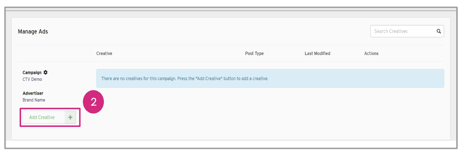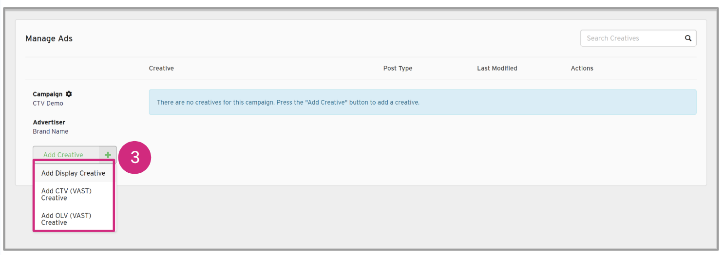- Select either of the option to Add CTV (VAST) Creative or Add OLV (VAST) Creative button.
