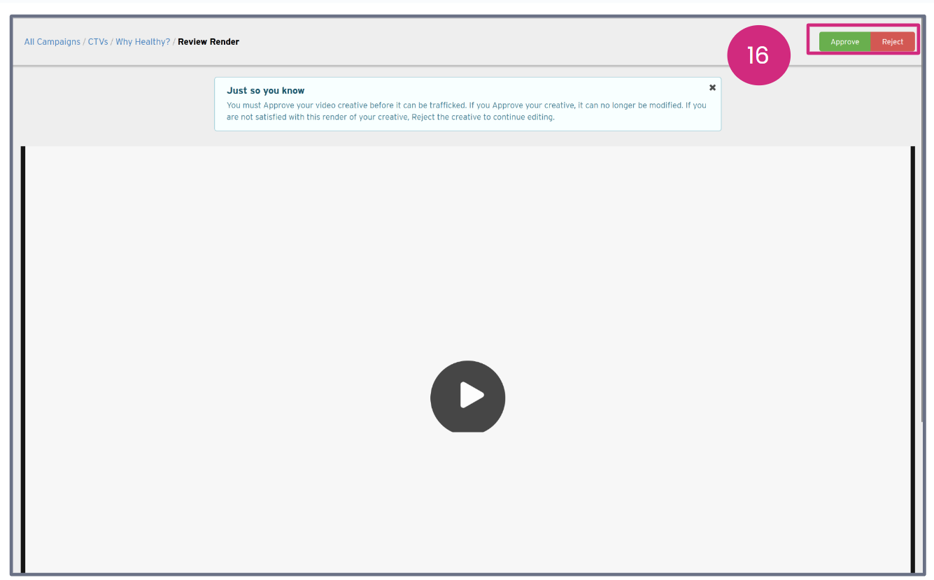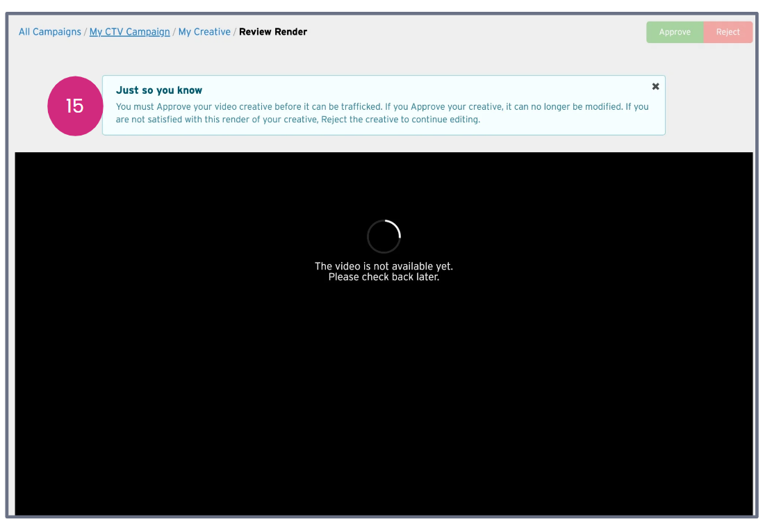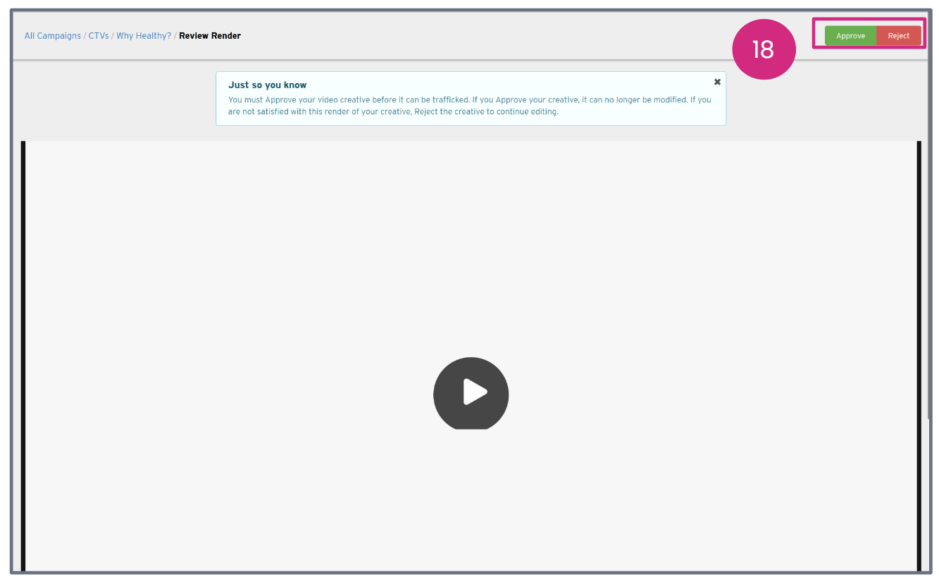 18. If you’re not satisfied, Reject the creative and resubmit another render once you’ve made changes. Rejecting the render returns the creative to the editing stage .