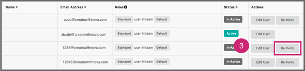 3. Find the user from the list of inactive users in the Nova platform. Then, select the re-invite option to send them a re-invitation.