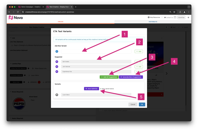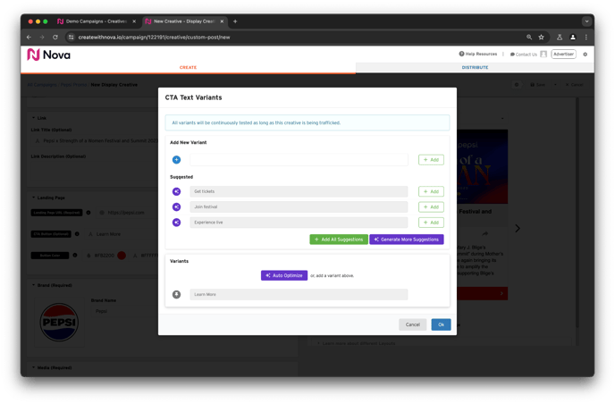 💡 NOTE: Please note that for CTA Text Variants, AI suggestions are based on the creative content & historical performance of CTA Text values.