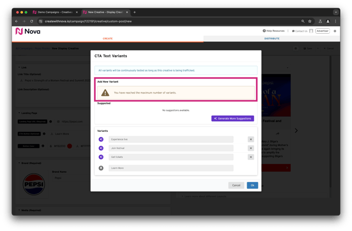 Max of 3 Variants: You can have up to 3 variants for CTA colour and CTA texts separately. A warning appears if you reach the limit.