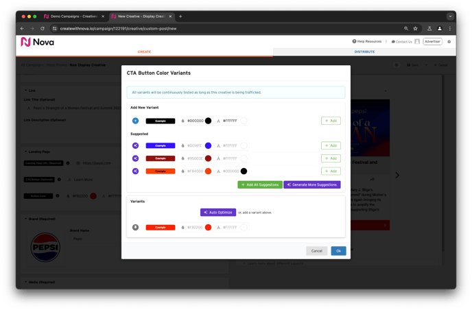 This guide provides steps to use Nova's AI tools to create multiple CTA button text and color options and to manage and preview variants. These variants automatically rotate and optimize for best performance geared towards the your goal.