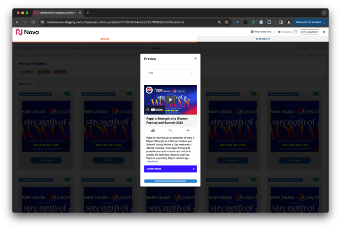 Variant Preview Size - Select the size for the creative preview: Flex or Fixed from the dropdown.