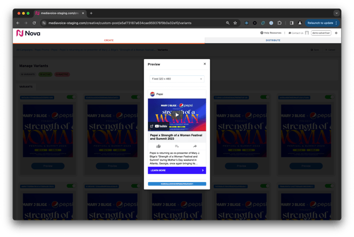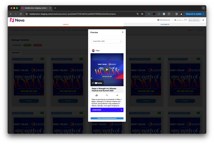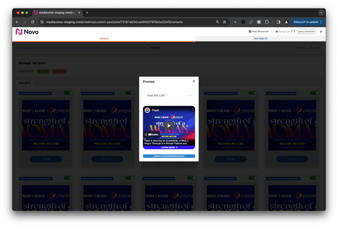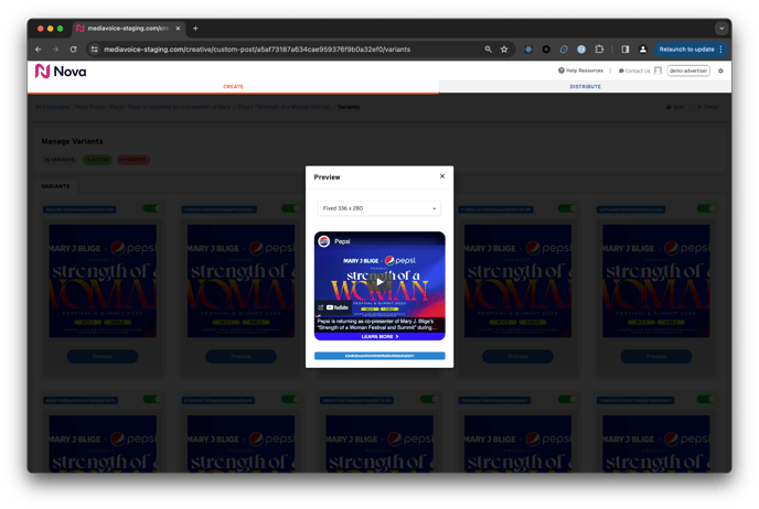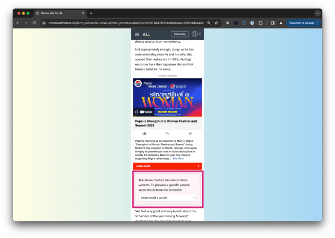 Note: If you have some custom configuration for your preview sites in your account you may not see the message box with a Variant selector below the creative. Please raise a ticket with Nova Support and we will setup standard Preview sites to allow for variant demos.