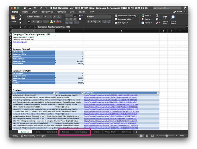The downloadable Campaign Performance Report features new breakout tabs, Variants and Variants (Daily).