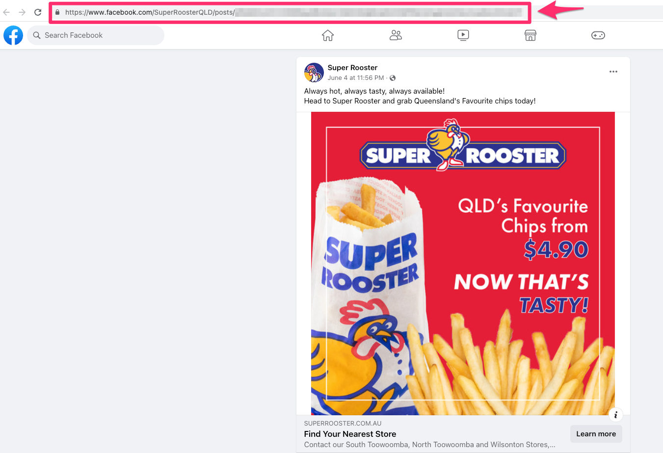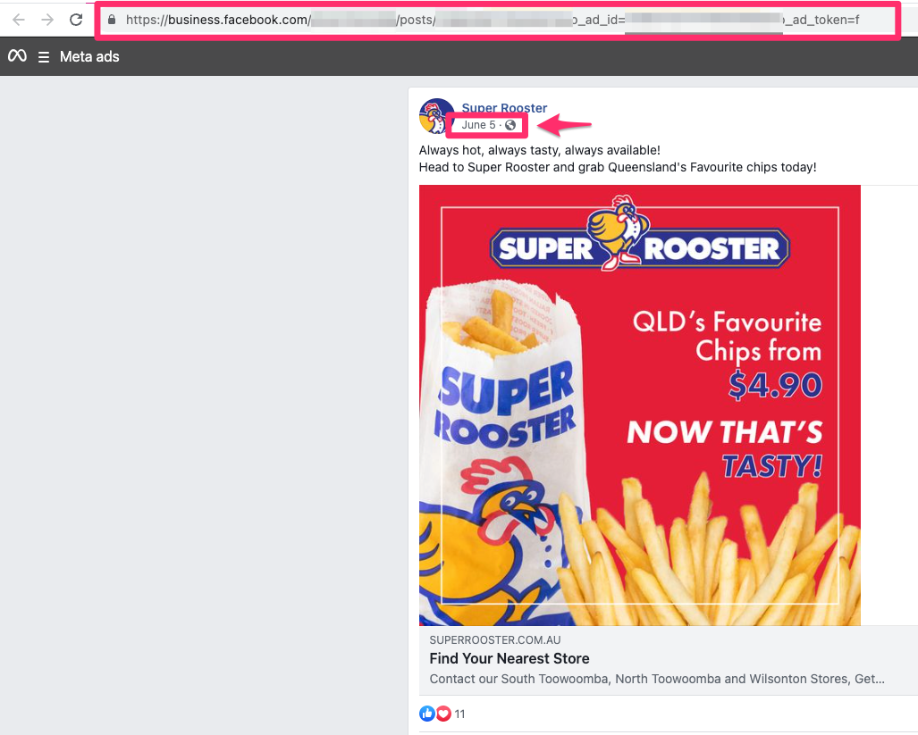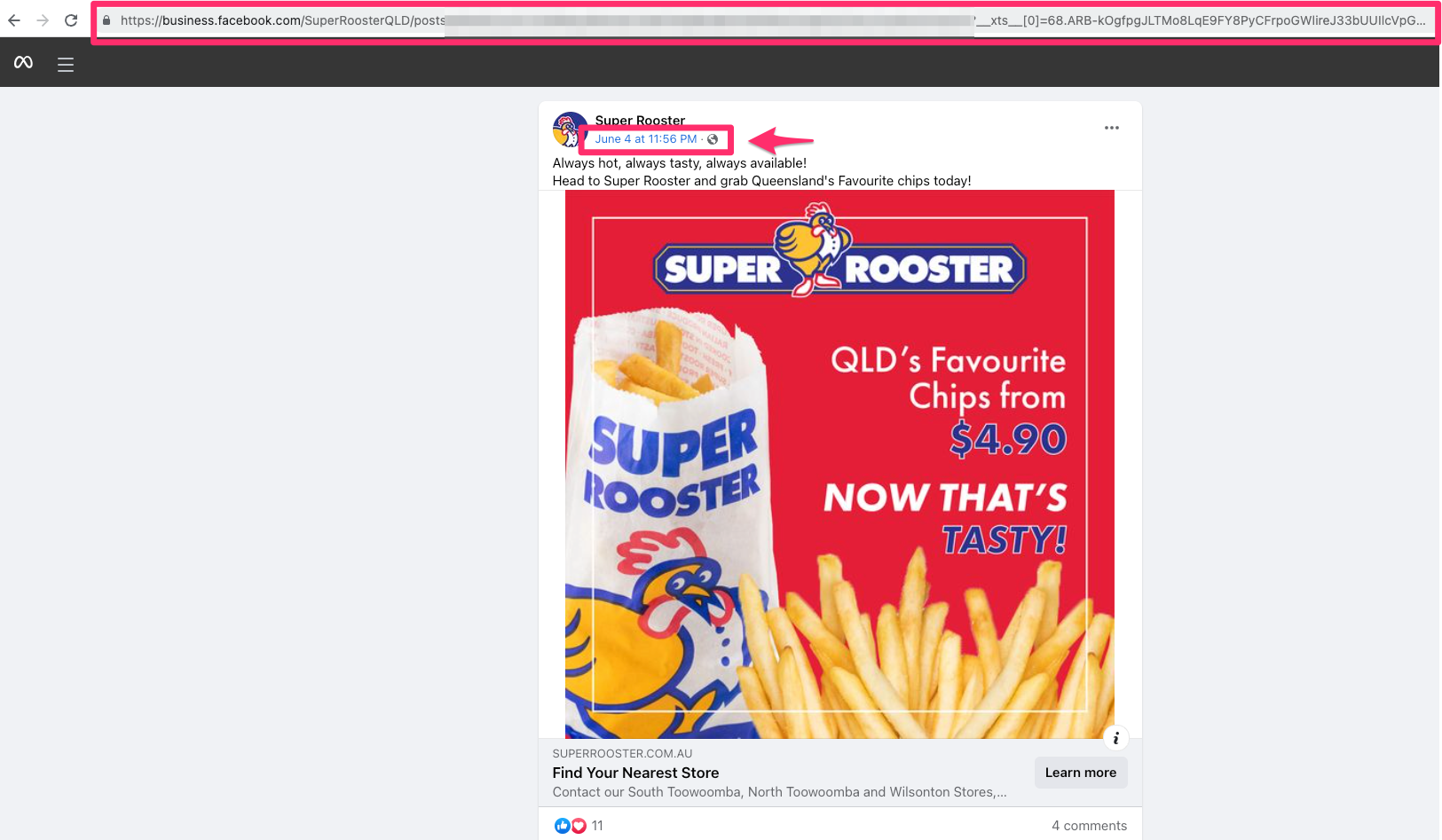- The screenshot below shows a sample Business post from Facebook/Meta Platform where you'll need to click on the Timestamp (as highlighted with arrow)