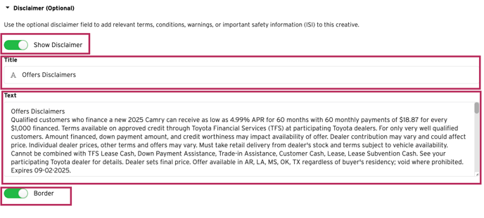 Turn the Disclaimer Toggle On in the creative, so the fields become editable.