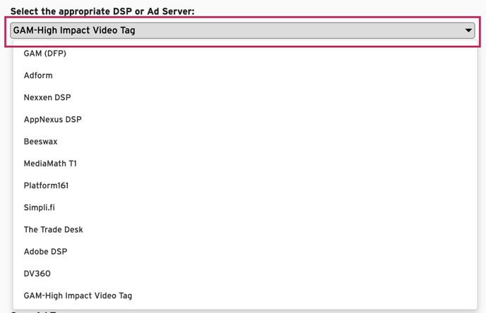 Select the correct tag named High Impact Video Tag, which has been set up by the Nova Support Team for your desired DSP.