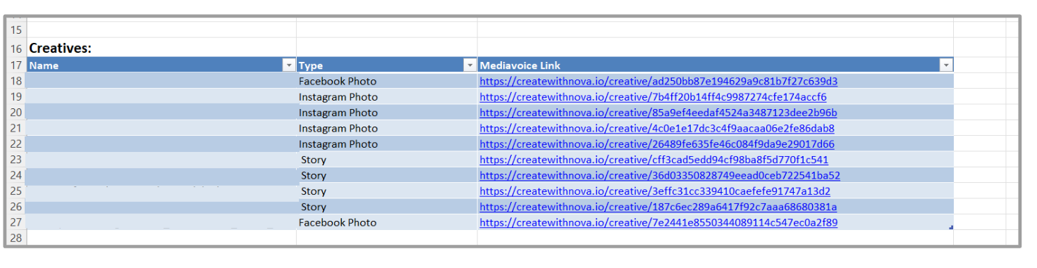 - The Creatives section shows the creative name, type, and link to each
