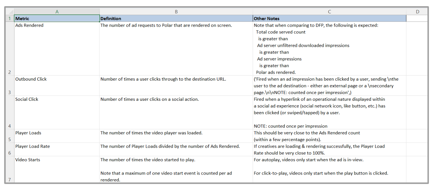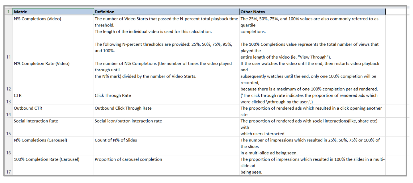 The definitions tab gives definitions for each term in the campaign performance report along with additional notes