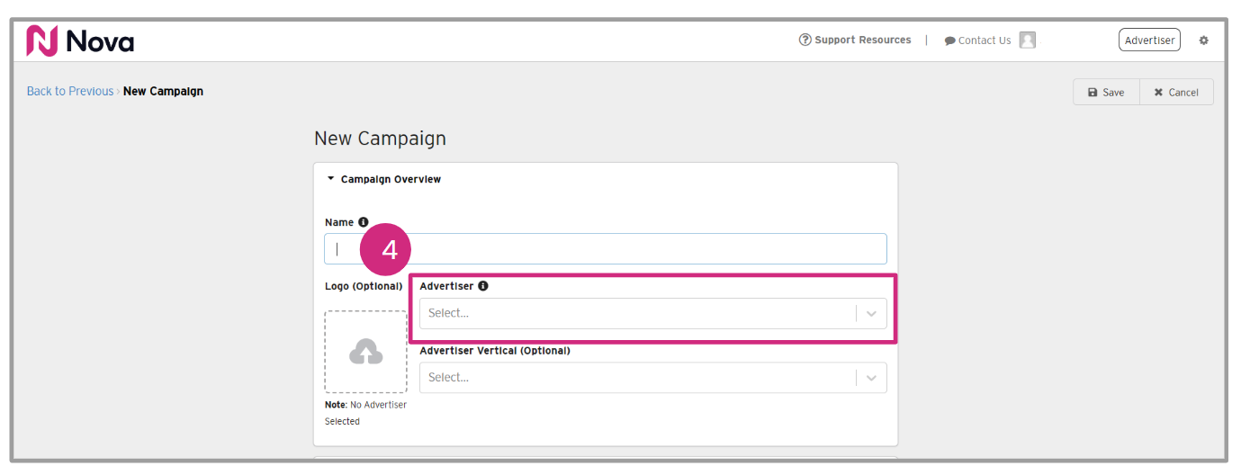 - Select an Advertiser from the drop down menu or manually type one in