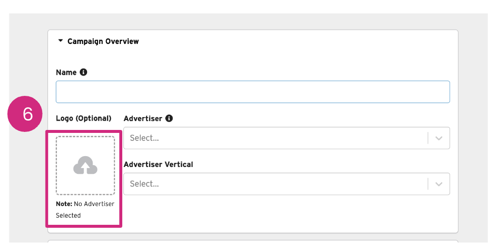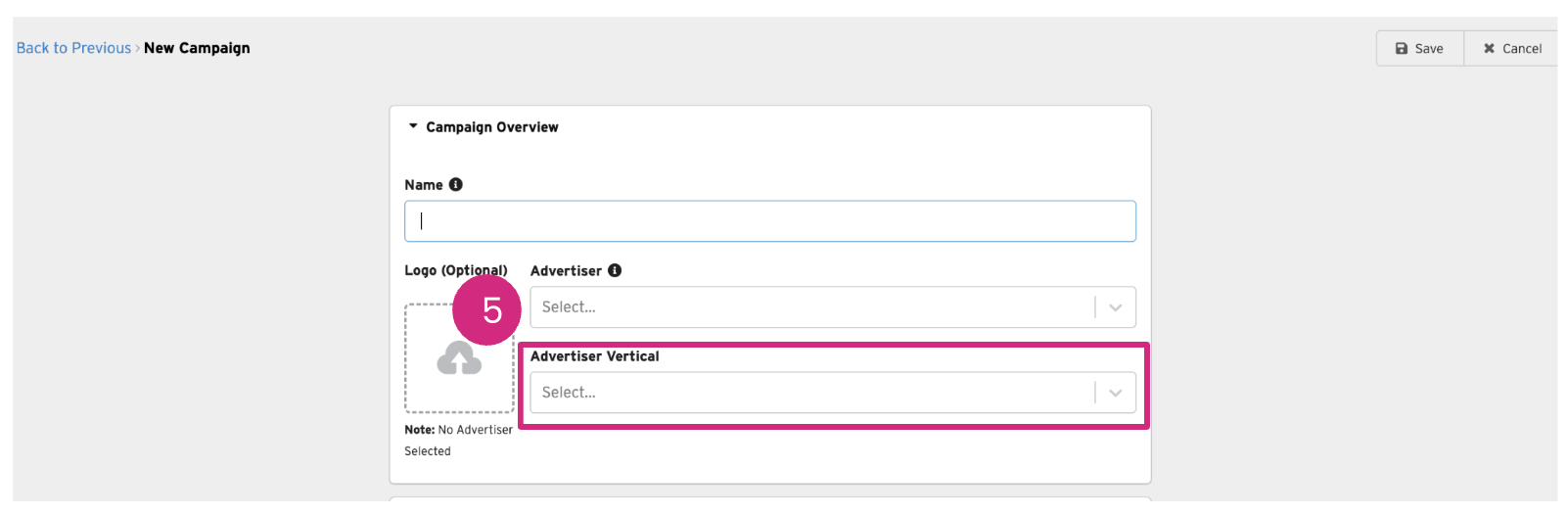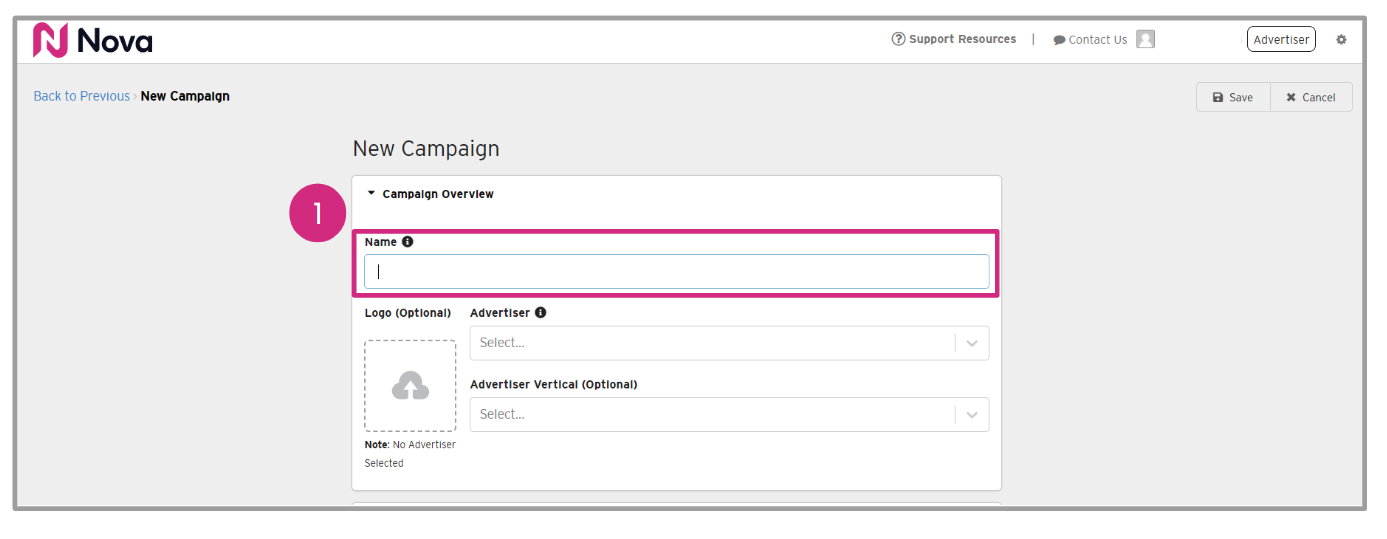 - Name your campaign using the same campaign name that is used in the DSP and add the Advertiser and Advertiser Vertical