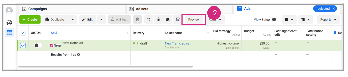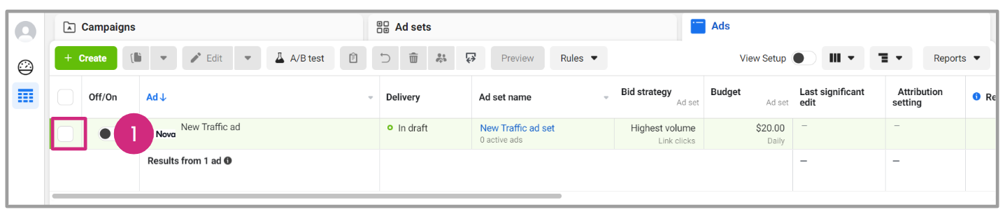 - In the Meta/Facebook Ad Manager, click on Campaigns and click on the box next to the ad
