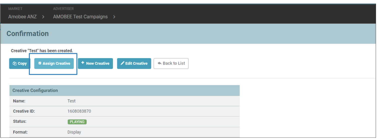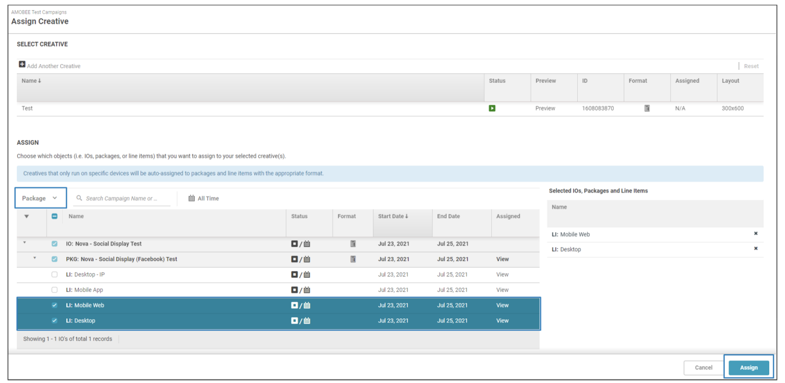 - Assign the creative to the relevant Insertion Order, Package, or Line Items
