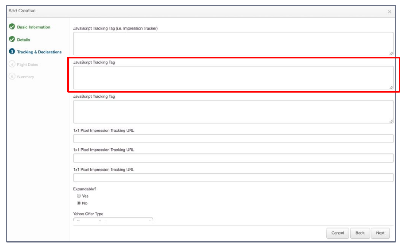 - Optional: Add viewability script to the JavaScript Tracking Tag field