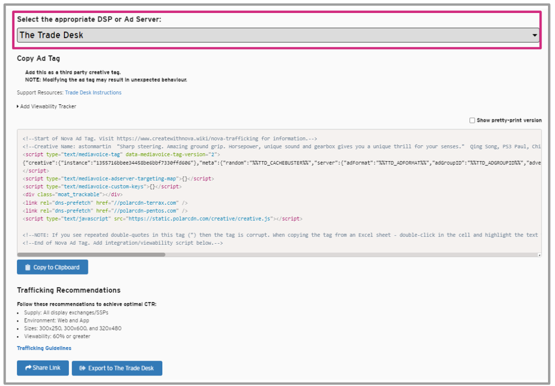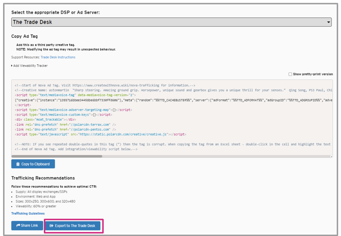 Nova workflow integration with The Trade Desk (TTD) DSP enables you to export Nova ad tags directly to your TTD account.
