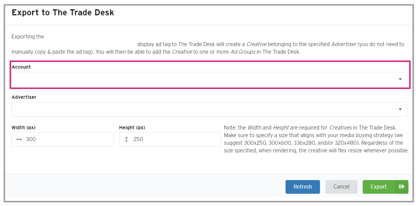 - Select the TTD account you want the creative exported to: