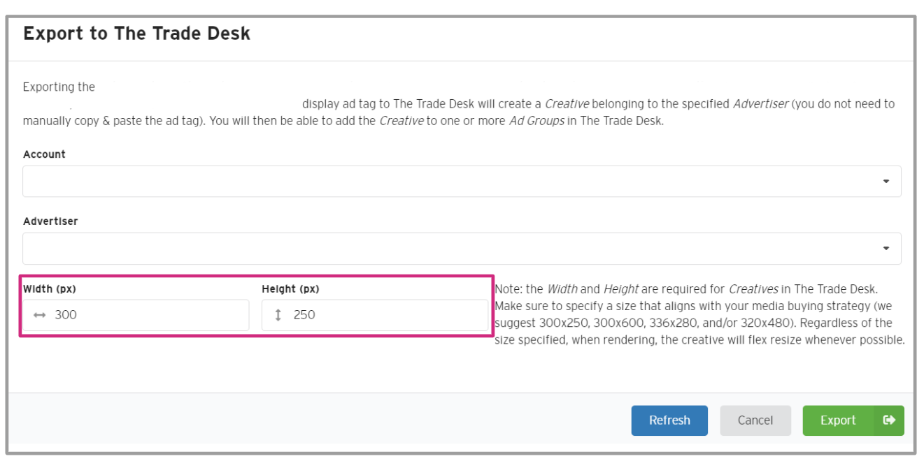 Exporting the ad tag will create a Creative belonging to the specified Advertiser. You will then be able to add the Creative to one or more Ad Groups in The Trade Desk.