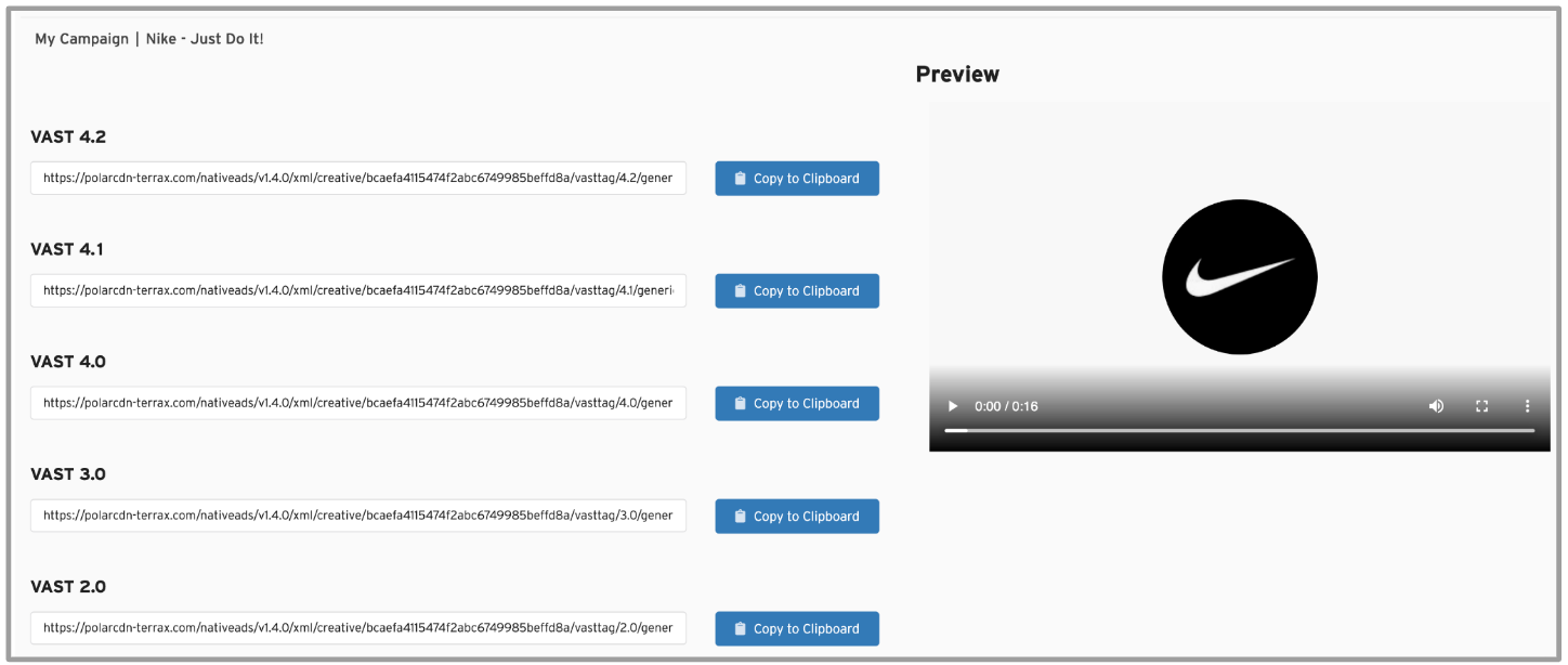 Locate the correct version of the VAST URL for your desired DSP / Ad Server, and click the Copy to Clipboard button.