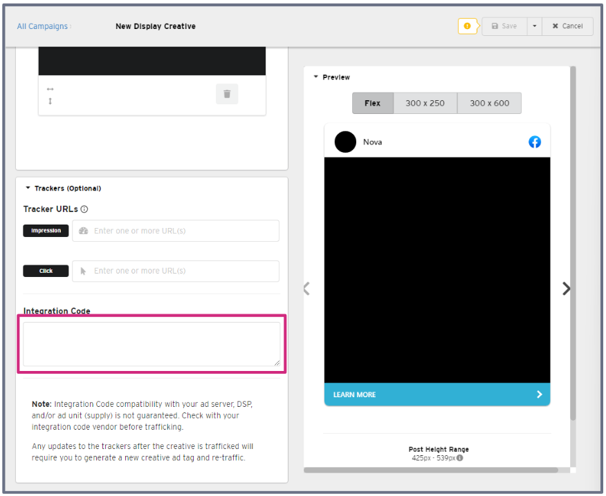 - If you add Viewability trackers (such as IAS/MOAT/DoubleVerify) to the Integration Code field in the Nova UI and make any changes to them after exporting the Nova tags, you will need to export a fresh copy of the Nova tags and re-traffick them in your DSP/Adserver.