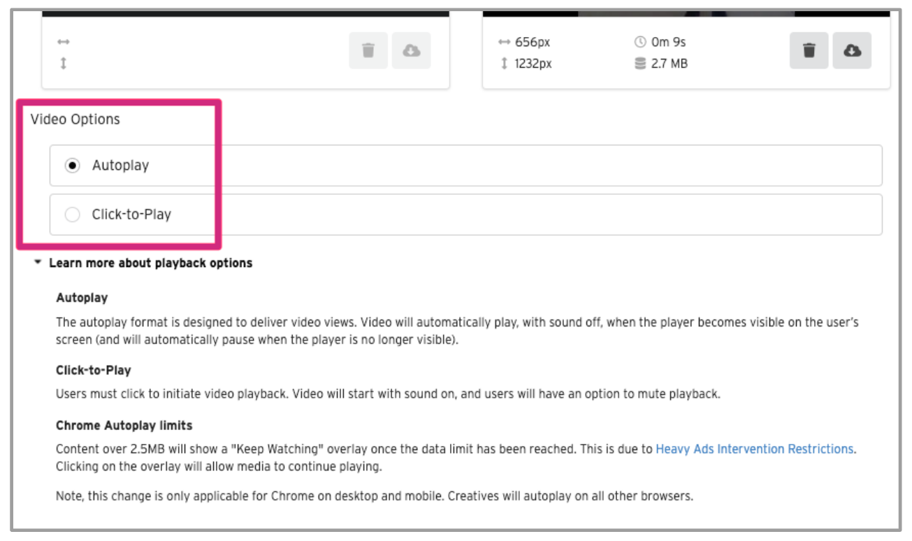 - Once the creative is saved, the video option (autoplay/click-to-play) cannot be altered
